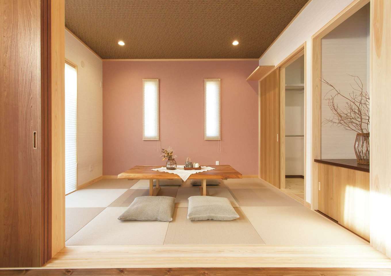 クロスの貼り分けだけで和モダンを演出 最近は本格和室よりもこっちのテイストが好まれます 和モダン 畳コーナー 畳 クロス 壁紙 吊り押入れ 和室照明 自然素材 注文住宅 座卓 高気密 高断熱 高耐震 結露しない家